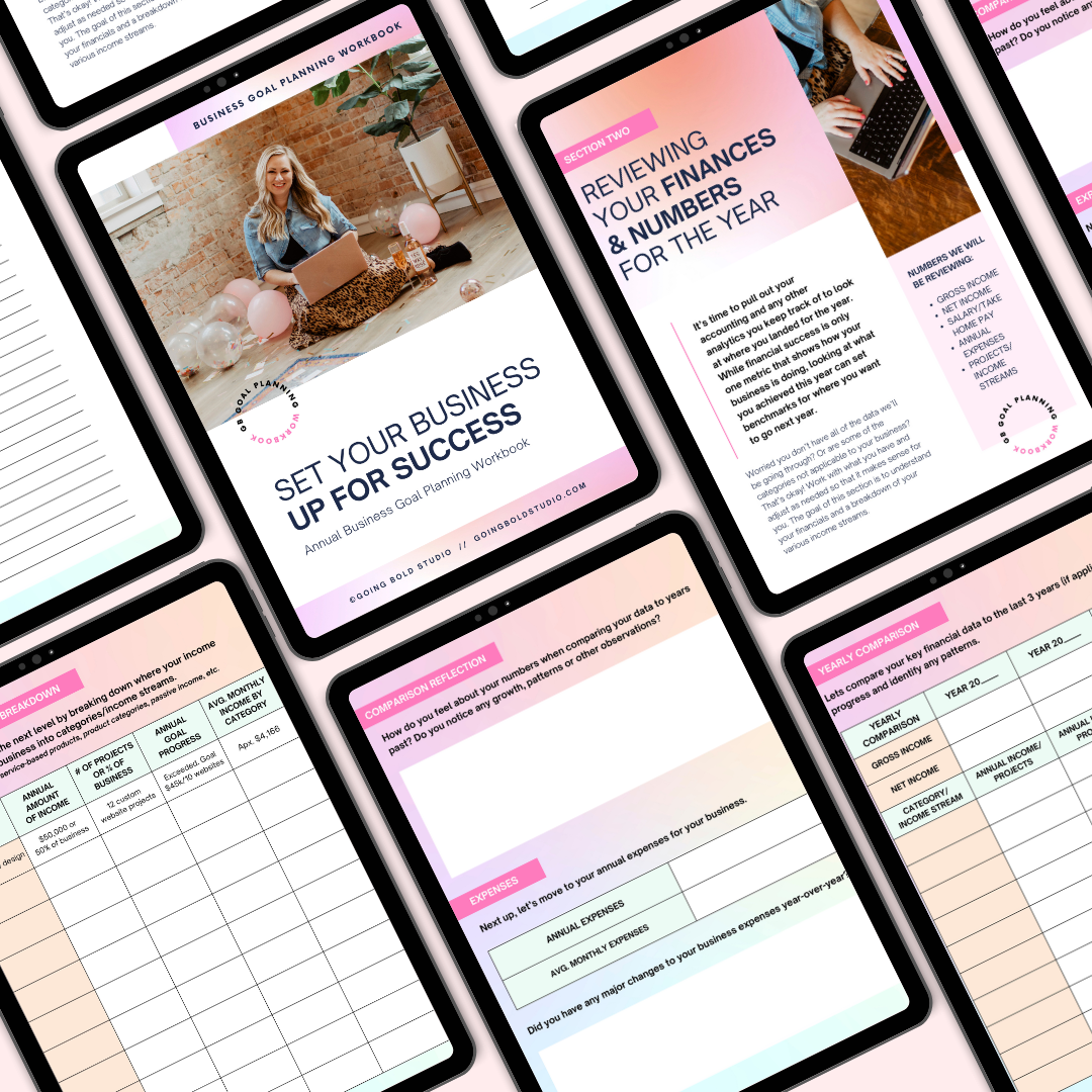Set your business up for success this year with our complete Business Goal Planning Workbook. The workbook includes 35+ pages of journal prompts, reflection questions, and fill-in-the-blank sections to plan your goals for the year.